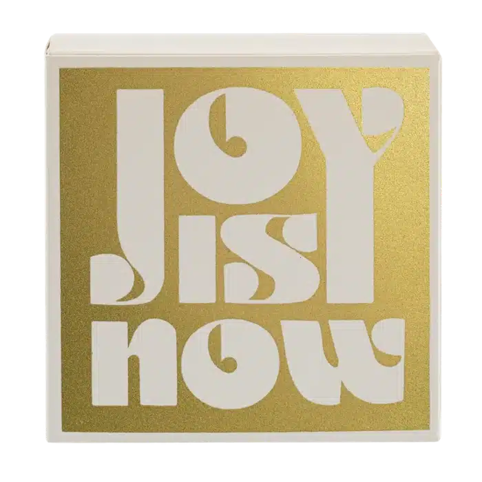 Sur une table basse, une console ou une étagère, la boîte Joy Is Now attire l’œil comme un petit objet d’art. Sa typographie audacieuse, mise en valeur par un fond doré lumineux, apporte une touche de modernité et de raffinement. Placée près d’un bougeoir ou d’un diffuseur, elle devient un détail déco qui fait toute la différence.