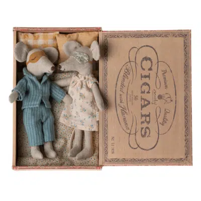 Papa et Maman souris portent leurs magnifiques vêtements de nuit et leurs masques pour les yeux. La boîte à cigares est un lit parfait pour une bonne nuit de sommeil et de beaux rêves.