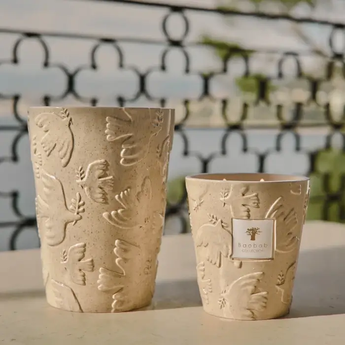 La bougie Baobab Paz Paloma se distingue par son contenant unique façonné avec passion par des artisans portugais. Sa structure en céramique couleur ivoire met à l’honneur une douceur tactile incomparable dès la première prise en main. Les créateurs jouent sur les contrastes avec un émail naturel qui alterne subtilement entre des surfaces brillantes et mates.