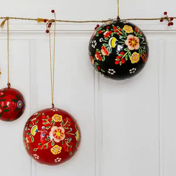 Le choix du papier mâché comme matériau de base confère à cette boule une légèreté et une délicatesse remarquables. Chaque pièce est d’abord moulée, puis poncée pour obtenir une surface parfaite. Le motif de fleurs est ensuite appliqué et peint à la main. Ce processus garantit que chaque boule est une œuvre d’art miniature. Les couleurs sont souvent riches et vibrantes.