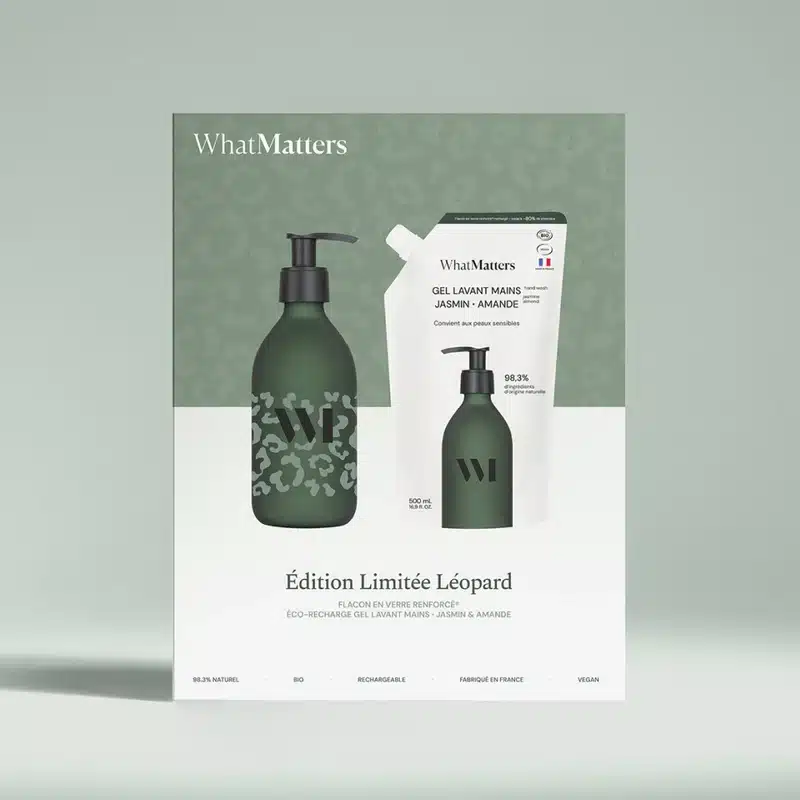 Le Coffret Gel Mains Léopard de What Matters est une édition limitée et audacieuse. Il vous invite à (re)découvrir leur gel lavant mains culte. Vous offrez ou vous vous offrez un véritable rituel sensoriel. Ce coffret exclusif met l’accent sur la durabilité et le plaisir olfactif.