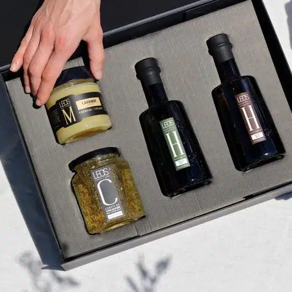 Chaque élément de ce coffret gourmand reflète l’excellence du Domaine de Leos. Les olives, cultivées près de l’Isle sur la Sorgue, bénéficient d’une récolte et d’une trituration optimisées pour préserver leurs saveurs. Le thym sauvage, récolté sur le domaine, insuffle son caractère unique aux préparations. C’est un coffret Patrick Bruel qui met en lumière un terroir d’exception et un engagement pour la qualité. C’est un cadeau gourmet par excellence. Il permet d’offrir ou de s’offrir une expérience culinaire provençale complète et raffinée. Il conviendra aux passionnés de cuisine et aux amateurs de produits d’exception.