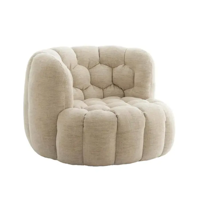 Ce fauteuil design contemporain et pivotant se distingue par son esthétique audacieuse, caractérisée par un capitonnage généreux évoquant la douceur d’un nuage. Sa silhouette tout en rondeurs apporte une touche de modernité immédiate, tout en conservant une élégance intemporelle. Que vous souhaitiez habiller un salon ou créer une atmosphère intimiste, ce fauteuil en tissu s’adapte à vos envies. Son revêtement texturé à la teinte crème lumineuse capte la lumière naturelle, offrant un rendu visuel chic et apaisant.