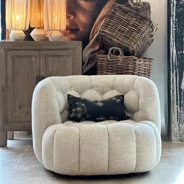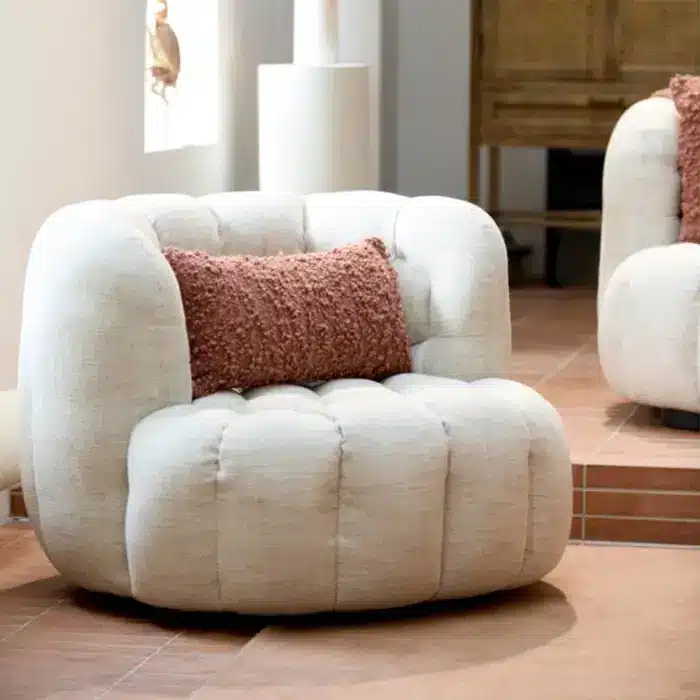 Le fauteuil lounge design AMARA redéfinit les codes du bien-être pour s’imposer comme la pièce maîtresse de votre intérieur. Ce fauteuil design contemporain se distingue par son esthétique audacieuse, caractérisée par un capitonnage généreux évoquant la douceur d’un nuage. Sa silhouette tout en rondeurs apporte une touche de modernité immédiate, tout en conservant une élégance intemporelle. Que vous souhaitiez habiller un salon ou créer une atmosphère intimiste, ce fauteuil en tissu s’adapte à vos envies. Son revêtement texturé à la teinte crème lumineuse capte la lumière naturelle, offrant un rendu visuel chic et apaisant.