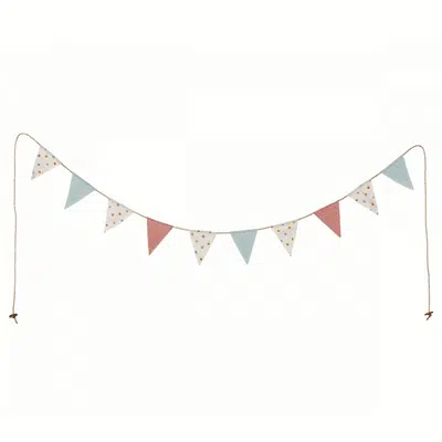 Cette Mini Guirlande de drapeaux est réalisée en un joli coton. Elle est parfaite pour n’importe quel endroit dans la chambre des enfants. Elle contient 10 drapeaux de couleurs et à pois.