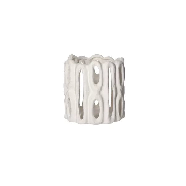 Le choix du grès pour la collection Cadiz assure une robustesse et une texture singulières. La couleur blanc craie apporte une luminosité et une pureté qui s’intègrent à tous les décors. La finition sablée est la signature de ce photophore. Elle est subtile, mais rugueuse au toucher. Elle crée un contraste avec la douceur de la lumière.