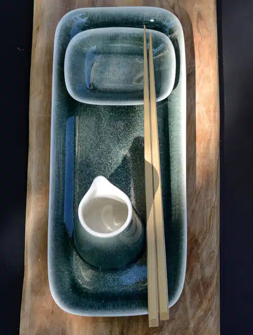 Chaque plat à sushi Maguelone est unique. Les légères variations de forme ou de teinte sont la signature d’une cuisson Grand Feu à 1 280°C, où l’alchimie des émaux crée des nuances vivantes et subtiles. Inspiré par la philosophie japonaise du Wabi Sabi, il célèbre la beauté de l’imperfection et l’émotion du geste artisanal.