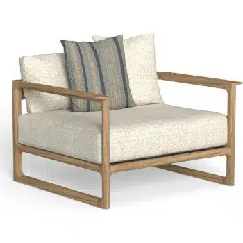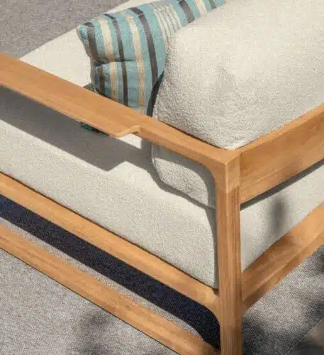 La composition disponible immédiatement en boutique est de bois naturel avec un tissu blanc cassé. Elle fait partie de la gamme premium avec des matériaux provenant à 70% d’Italie et 30% d’Indonésie. Elle comprend :