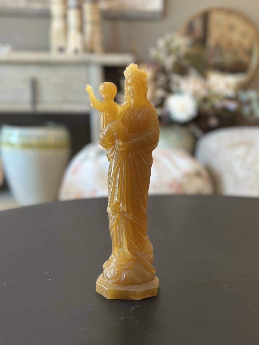 Cette vierge en cire se distingue par sa fabrication artisanale. La cire offre une texture douce et un aspect délicat à la statuette. Chaque détail de la Vierge avec son enfant est finement sculpté. Cela témoigne du savoir-faire de la Ciergerie des Prémontrés.