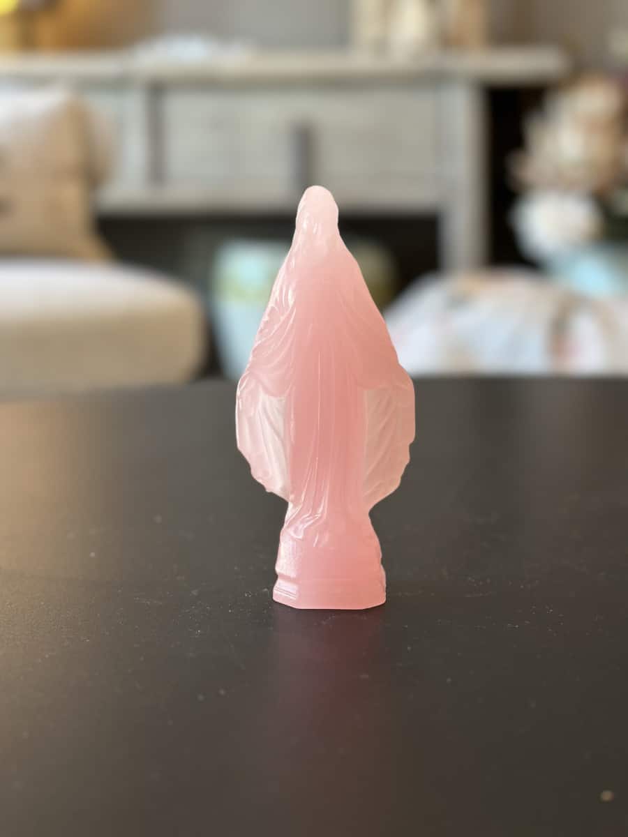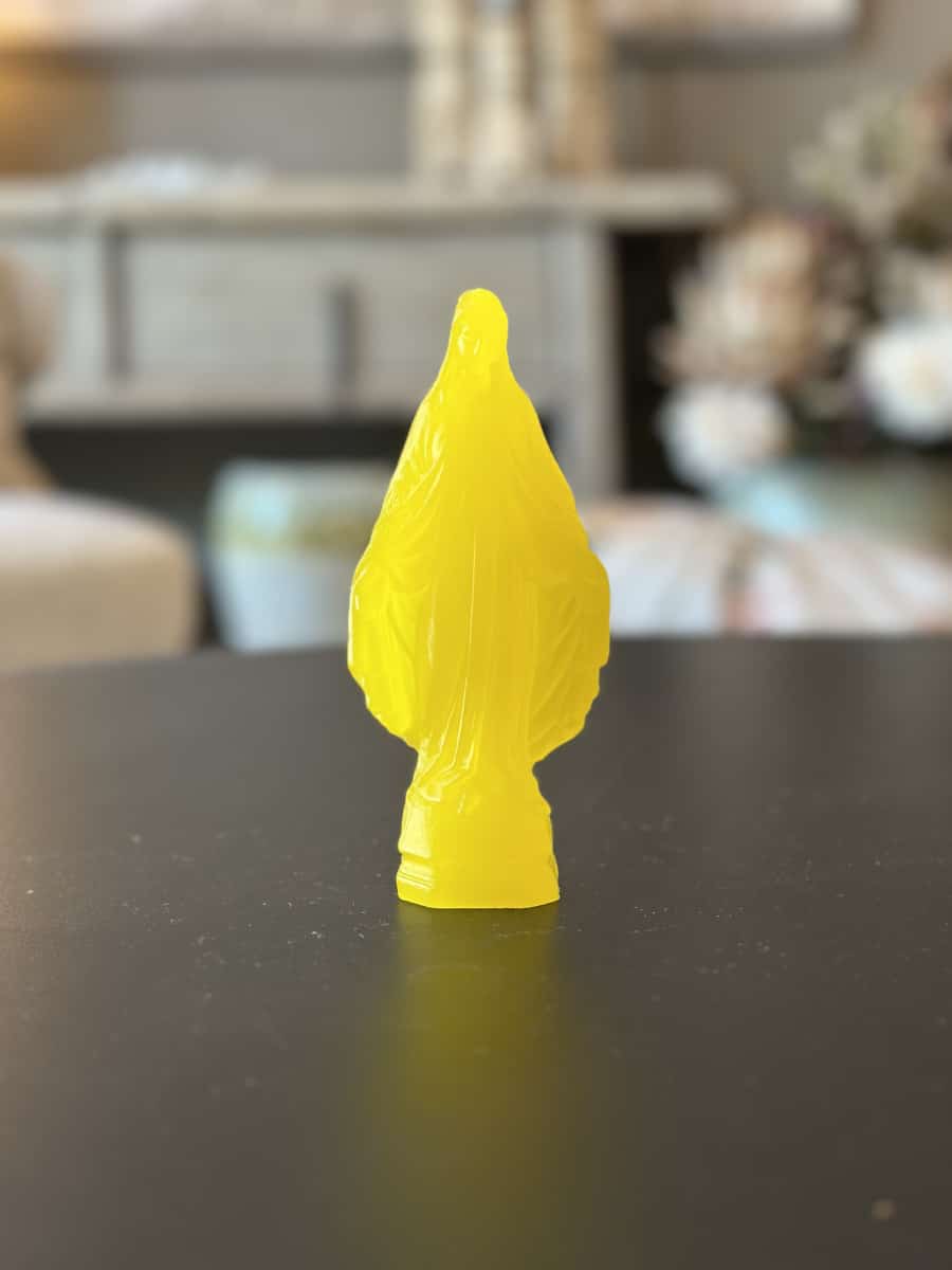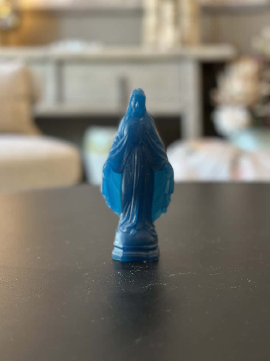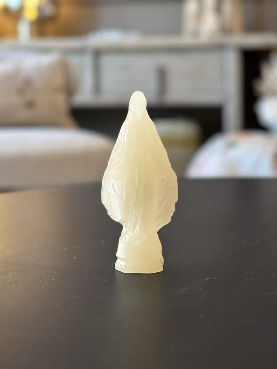 Cette mini vierge en cire se distingue par sa fabrication artisanale. La cire naturelle offre une texture douce et un aspect délicat à la statuette. Chaque détail de la mini vierge est finement sculpté. Cela témoigne du savoir-faire de la Ciergerie des Prémontrés.